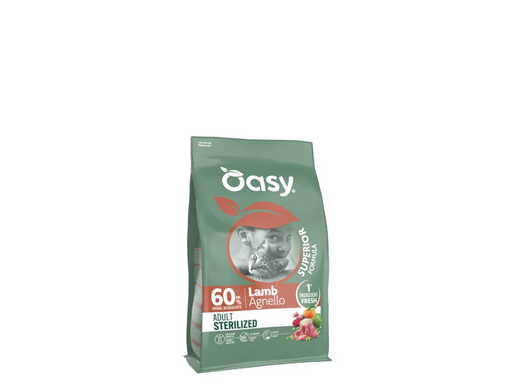 Oasy Cat Superior Sterilized Lamb - kompletné krmivo pre dospelé kastrované mačky od 1. roku života s vysokým obsahom jahňacieho mäsa.