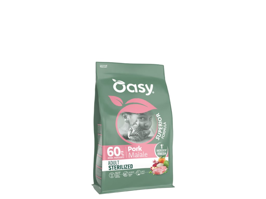 Oasy Cat Superior Sterilized Pork - kompletné krmivo pre dospelé kastrované mačky od 1. roku života s vysokým obsahom bravčového mäsa.