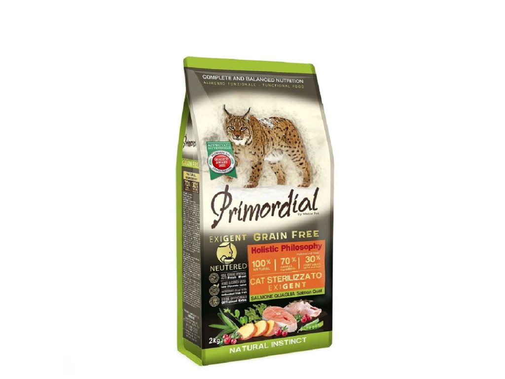 Primordial GF Cat Sterilized Exigent - Losos a prepelica je kompletné granulované krmivo pre dospelé kastrované mačky s vyberavými chuťmi. Extra žravé granule pre skutočných milovníkov mäsa.
