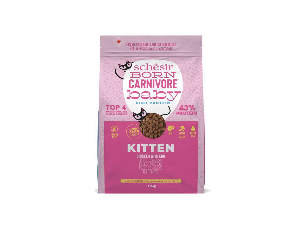 Schesir Cat Born Carnivore Kitten - Čerstvé kuracie s vajcom je kompletné krmivo vo forme pomaly pečených granúl pre mačiatka s vysokým obsahom bielkovín. Receptúra Born Carnivore bola vyvinutá pre skutočných mačacích mäsožravcov s fyziologickou potrebou prijímať čerstvé mäso a ryby. Receptúra inšpirovaná prirodzenou potravou mačiek vo voľnej prírode s vysokým obsahom bielkovín (43%) pri nízkom obsahu sacharidov (9,8%).