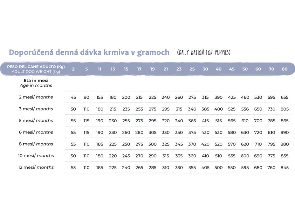 Odporúčaná denná dávka: tabuľku odporúčanej dennej dávky v gramoch v závislosti od aktuálneho veku v mesiacoch a váhy šteňaťa v dospelosti nájdete vo fotogalérii produtku.