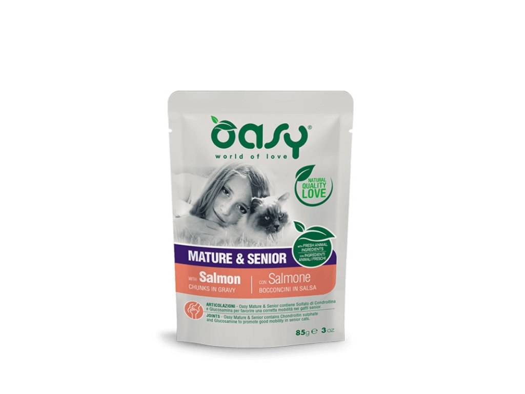 Oasy Cat Chunks in Gravy - Mature&Senior Losos v šťave je kompletné krmivo pre staršie mačky od 7 roku života. Jemné kúsky mäsa v omáčke pre každodennú radosť Vašej dospelej mačky. Pripravené s vysokým obsahom živočíšnych bielkovín a úplne bez lepku, umelých aróm a farbív. Znížený obsah tuku naopak podporuje udržiavanie hmotnosti Vašej staršej a menej aktívnej mačky. S prídavkom kĺbovej výživy ako podpory pohybového ústrojenstva mačky.