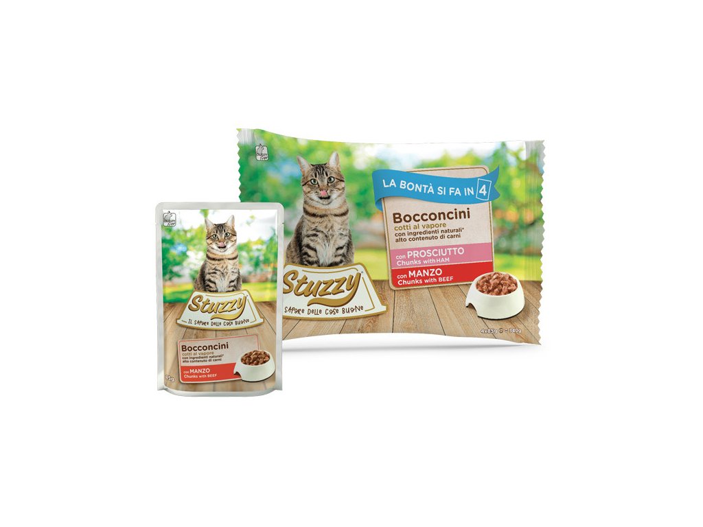 Stuzzy Cat Chunks Multipack hovädzie a bravčové kúsky obľúbené kapsičky pre mačky s kúskami mäsa v chutnej omáčke vo výhodnom balení po 4 kusy.