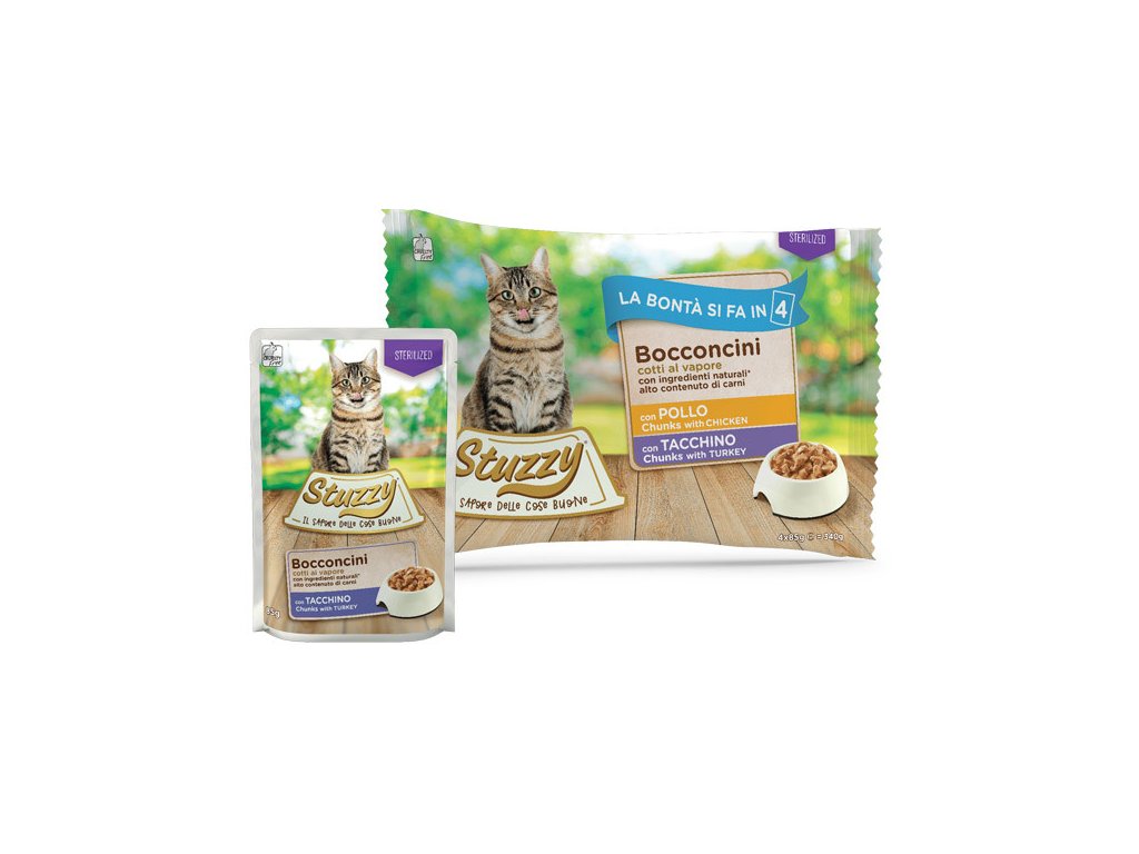 Stuzzy Cat Chunks Multipack Sterilized kuracie a morčacie kúsky - obľúbené kapsičky pre kastrované mačky s kúskami mäsa v chutnej omáčke vo výhodnom balení po 4 kusy.