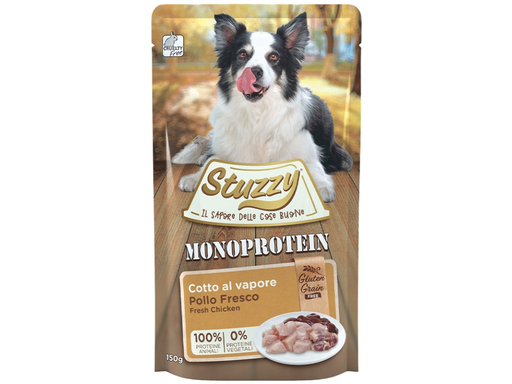 Stuzzy Monoprotein - kuracie paté je krmivo s kvalitnými ingredienciami pre psov všetkých plemien a špeciálne pre psov trpiacich na intoleranciu živočíšnych alebo rastlinných bielkovín. S jediným zdrojom živočíšnych bielkovín, bez obilnín a lepku, vysoko stráviteľné, bez pridaných farbív a konzervačných látok. Bez testovania na zvieratách s výživovo schváleným zložením Katedry veterinárnych lekárskych vied - Univerzita Alma Mater Studiorum v Bologni.