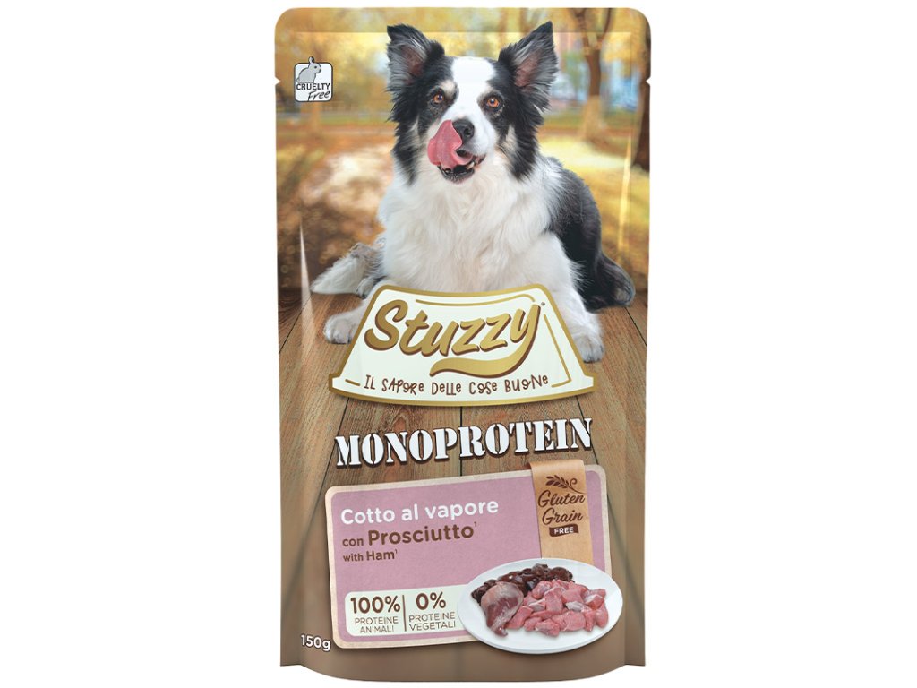 Stuzzy Monoprotein - šunkové paté je krmivo s kvalitnými ingredienciami pre psov všetkých plemien a špeciálne pre psov trpiacich na intoleranciu živočíšnych alebo rastlinných bielkovín. S jediným zdrojom živočíšnych bielkovín, bez obilnín a lepku, vysoko stráviteľné, bez pridaných farbív a konzervačných látok. Bez testovania na zvieratách s výživovo schváleným zložením Katedry veterinárnych lekárskych vied - Univerzita Alma Mater Studiorum v Bologni.
