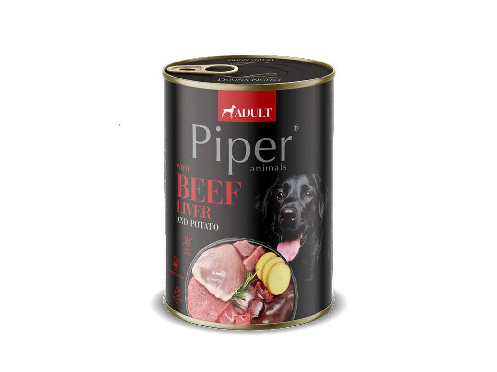 Piper Adult - hovädzia pečeň a zemiaky je kompletné krmivo pre dospelých psov všetkých plemien. Strava je ľahko stráviteľná a bohatá na bielkoviny. Pridanie hovädzej pečene, okrem vysokého obsahu ľahko vstrebateľného vitamínu A, zaručuje tiež vysoký obsah leucínu a izoleucínu a poskytuje železo a meď. Tieto minerály stimulujú obranné funkcie tela a antioxidačné vlastnosti telových tekutín. Pridanie zemiakov navyše stimuluje činnosť tráviaceho traktu a zvyšuje príťažlivosť krmiva.