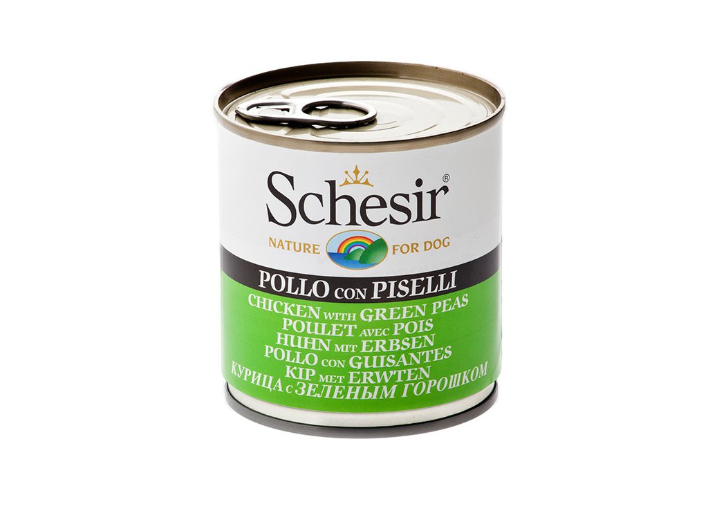 Schesir Dog - kuracie s hráškom je vynikajúca lahôdka pre psov v podobe celých kúskov kuracieho mäsa s hráškom. Pri výrobe sú použité len celé kúsky mäsa z kuraťa, žiadne kosti a vonkajšia koža sa nezapracováva do konzerv.