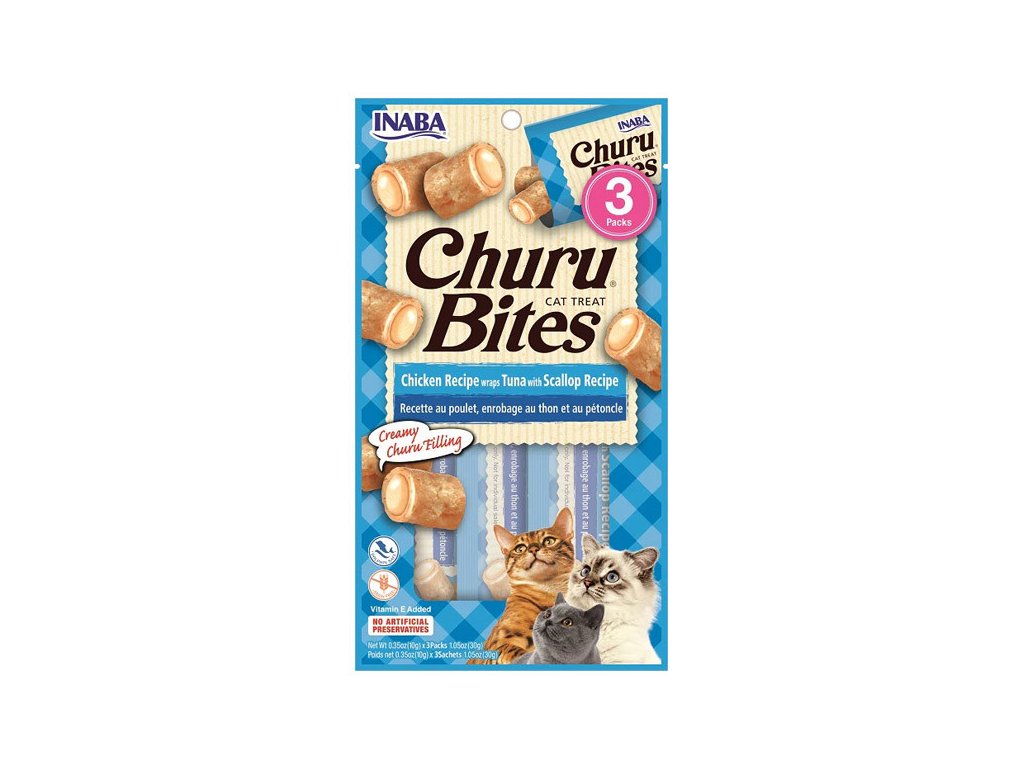 Churu Bites pamlsky sú mäkké prírodné pamlsky v tvare vankúšikov ochutené prírodnými výťažkami, extraktom zo zeleného čaju a vitamínom E. Majú nízky obsah kalórií, sú bez obilovín, konzervantov, umelých farbív, s vysokým obsahom vody. Každé jedno balenie obsahuje 3 jednotlivé sáčky, aby bola zachovaná maximálna čerstvosť. Dve rôzne konzistencie pri jednom zahryznutí.