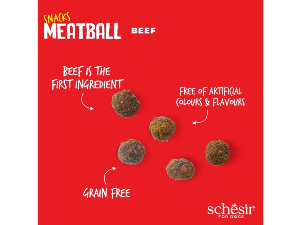 Schesir Dog Meatballs je zdravý tréningový pamlsok vyrobený v USA z hovädzieho mäsa. Mäsové guličky sú ideálnou odmenou Vášho psa. Pre tieto malé kúsky spraví Váš pes čokoľvek. Vhodné aj pre šteňatá. Mäkká konzistencia umožní okamžitú konzumáciu pamlsku a tak je pes okamžite pripravený na ďalšie povely.