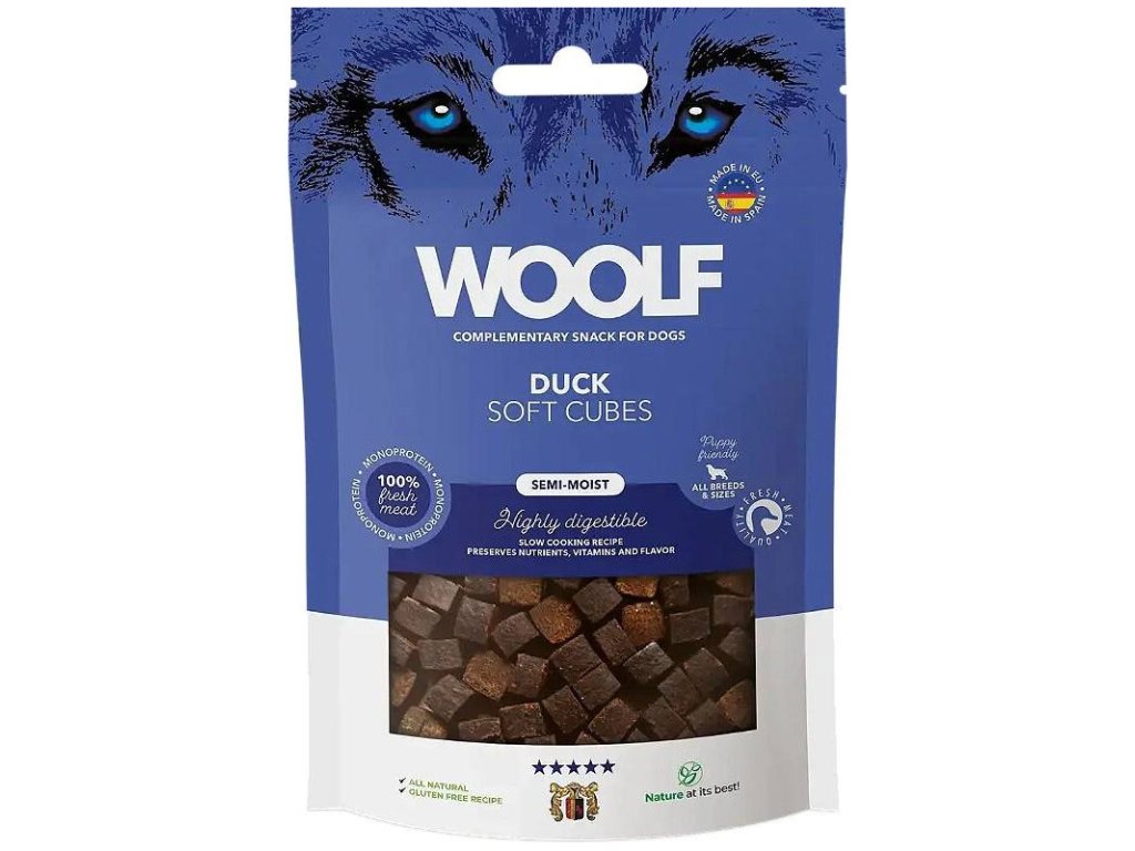 Woolf Soft Cubes je pochúťka pre psov, ktorá sa môže pochváliť výraznou polomäkkou textúrou získanou z úplne prírodných surovín. Je úplne prírodné: Tento pojem označuje použitie minimálne spracovaných surovín bez akýchkoľvek syntetických prísad, ako sú farbivá, arómy alebo konzervačné látky. V úplne prírodných pochúťkach pre psov sa používajú zdravé, rozpoznateľné zložky, ktoré sa bežne vyskytujú v prírode, ako napríklad skutočné mäso, zelenina, ovocie a obilniny. Polovlhké pochúťky pre psov slúžia ako prechodná štruktúra medzi suchými sušienkami pre psov a vlhkými konzervami. Sú mäkké, poddajné, ľahko sa žujú a majú vyšší obsah vlhkosti ako tradičné suché pochúťky, vďaka čomu sa psom ľahšie žujú a poskytujú chutnejší zážitok.