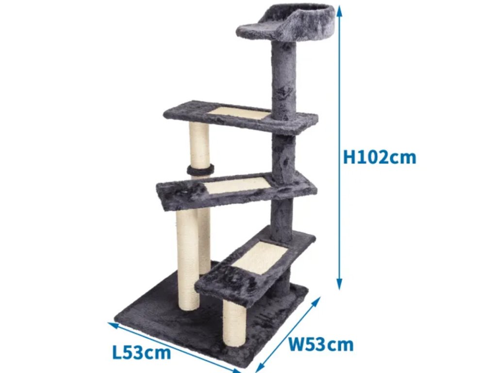 Škrabadlo s viacerými platformami pre mačky Nobleza sivé - je veľké škrabadlo viacerými platformami, po ktorých môžu Vaše mačky vystúpať až na samotný vrchol z ktorého majú dokonalý výhlad na všetko v ich okolí. Škrabadlo obsahuje oporné valce zo sisalového lana na brúsenie pazúrikov. Flanel a plyš ako povrchová úprava pôsobí komfortne. So širokou a stabilnou základňou.